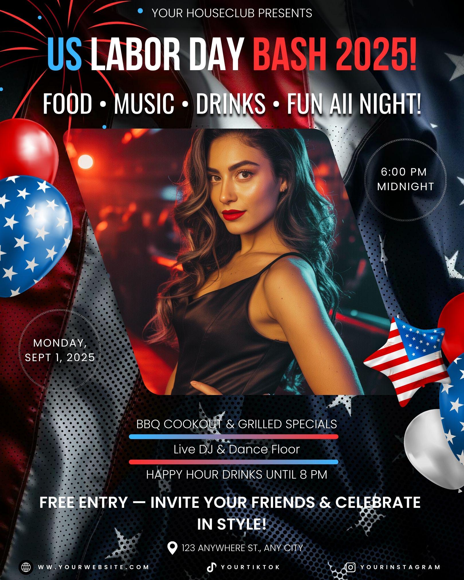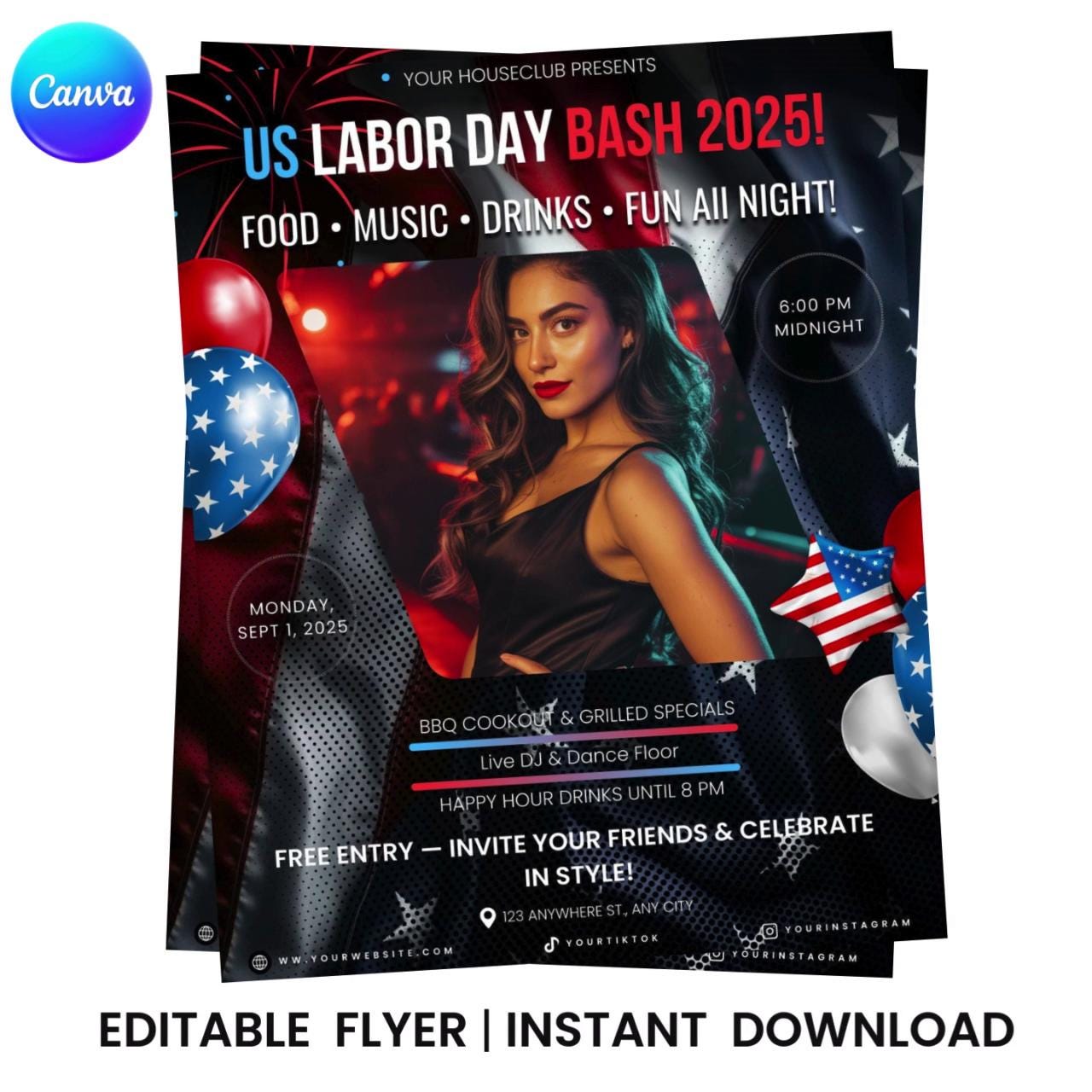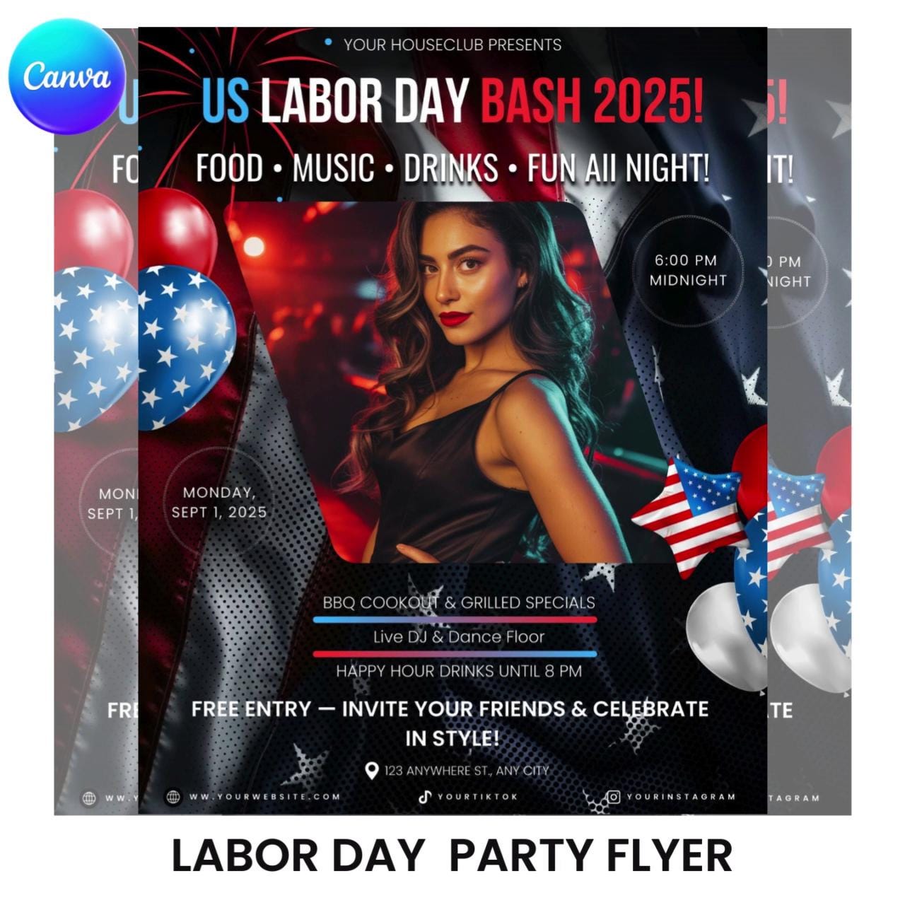 Celebrate in red, white, and blue with our Labor Day Party Flyer Template! 🇺🇸✨ Perfect for promoting your club event, BBQ cookout, or holiday celebration, this editable Canva flyer lets you customize text, colors, and event details to match your style.