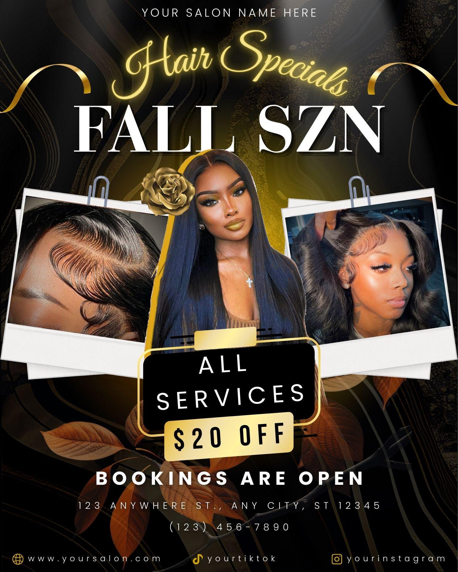 🍂✨ Attract new clients this season with our Fall Hair Specials Flyer Template! Designed for hair stylists, salons, and beauty professionals, this flyer is the perfect way to showcase your seasonal promotions and booking offers.