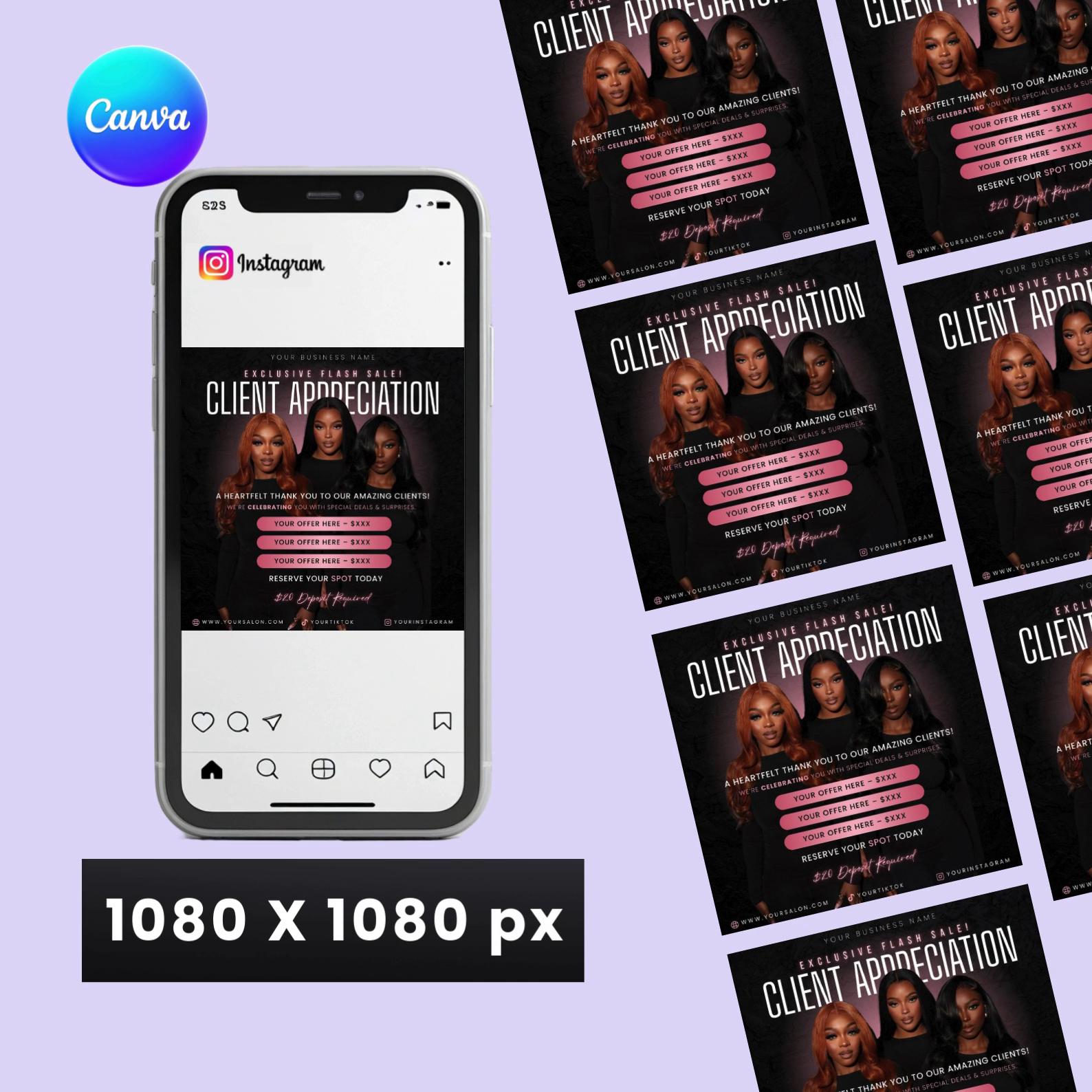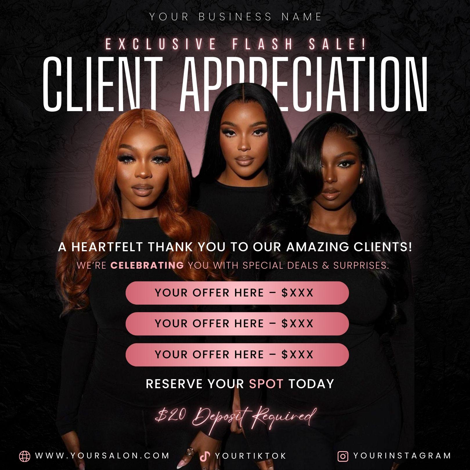 πβ¨ Show gratitude to your loyal clients with this elegant Rose Pink Client Appreciation Flyer Template! Perfect for hairstylists, salons, lash & nail techs, this flyer helps you highlight exclusive client deals in style.