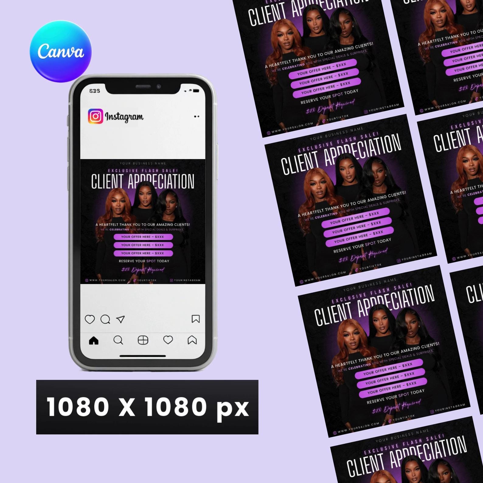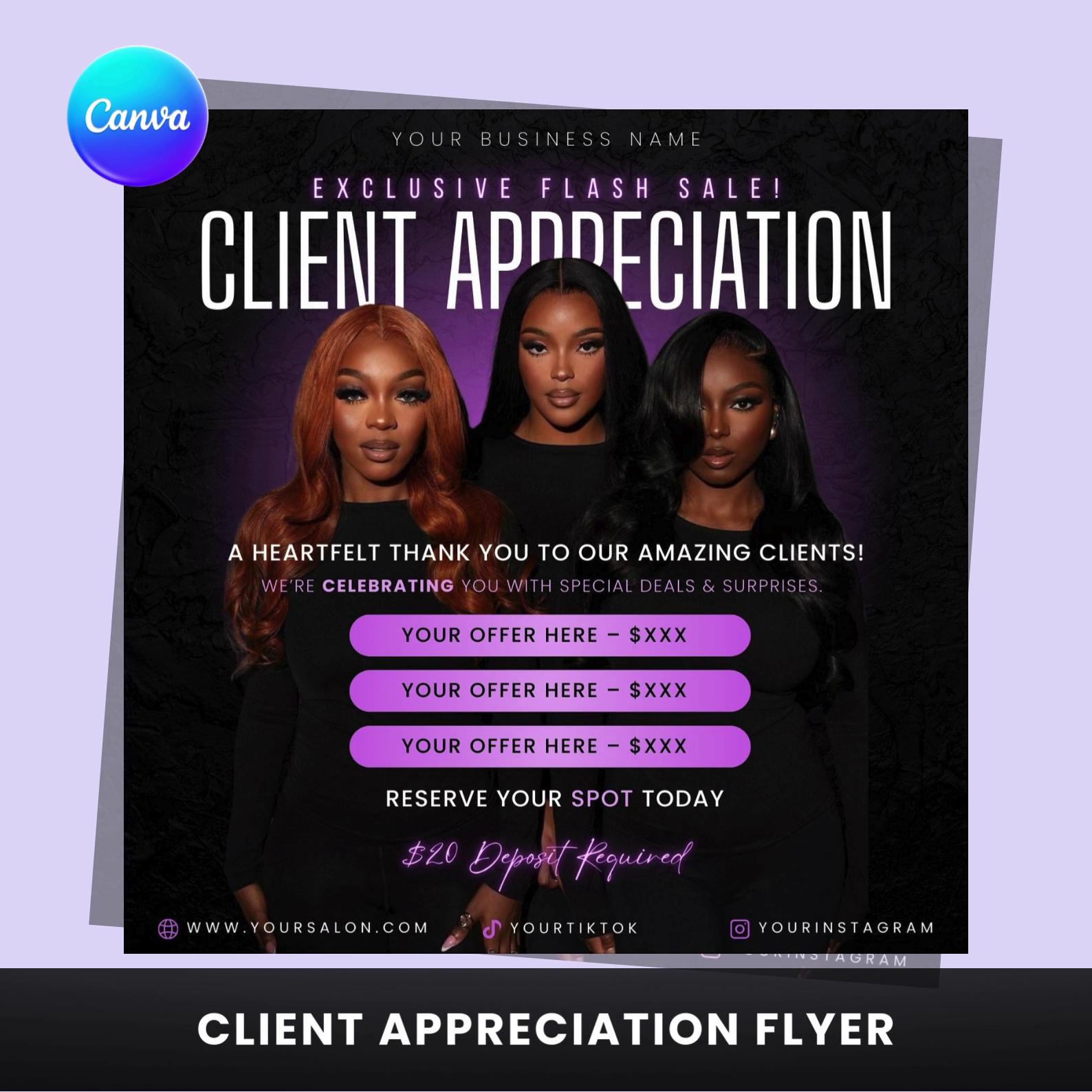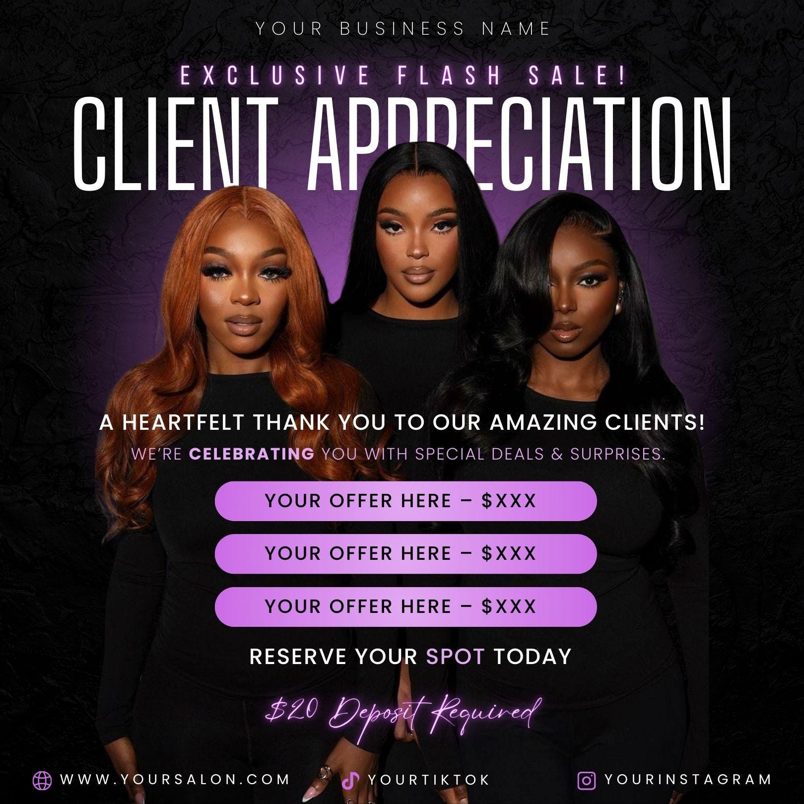 💖✨ Show gratitude to your loyal clients with this stunning Client Appreciation Flyer Template! Perfect for salons, hairstylists, lash techs, and beauty professionals, this flyer helps you promote exclusive deals, flash sales, and client thank-you events in style.