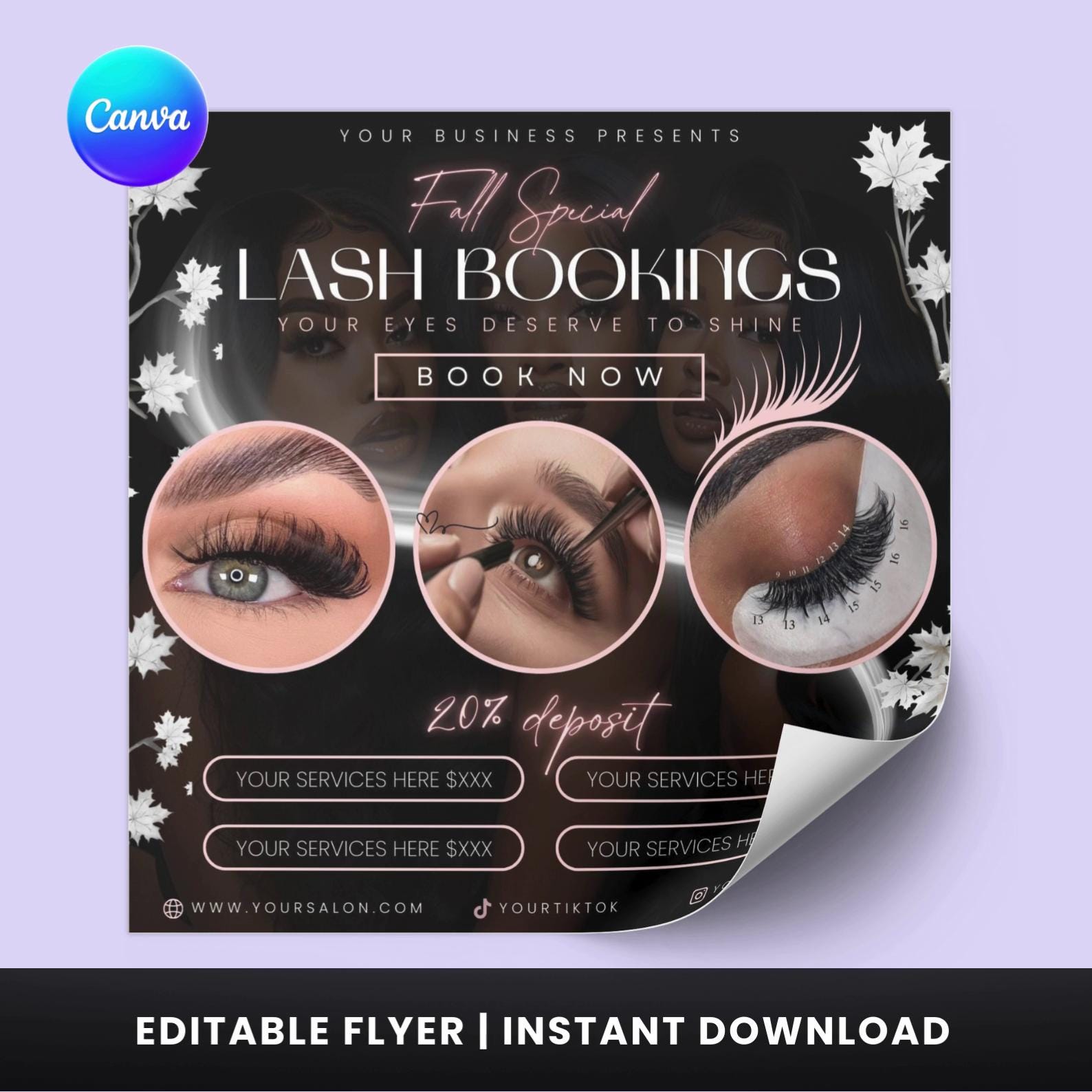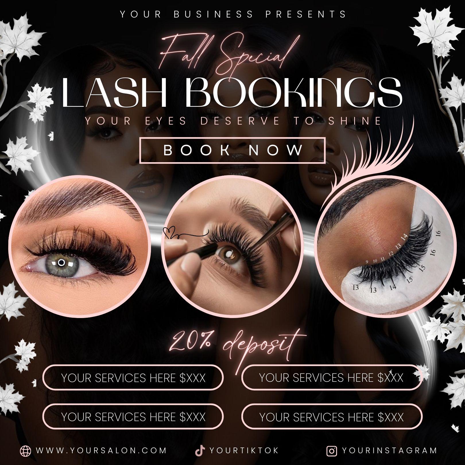 🍂✨ Boost your seasonal bookings with this elegant Fall Lash Booking Flyer Template! Perfect for lash techs, beauty salons, and professionals, this flyer highlights your services with a polished and professional look.