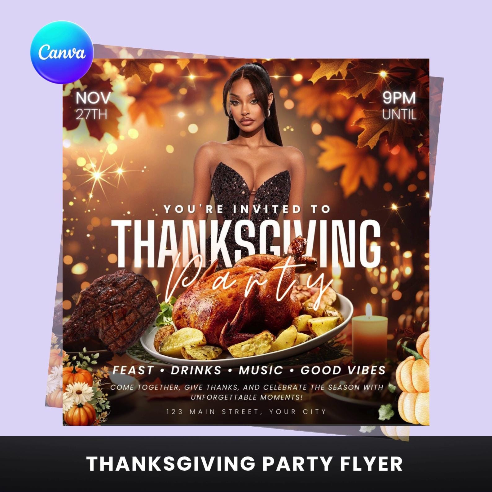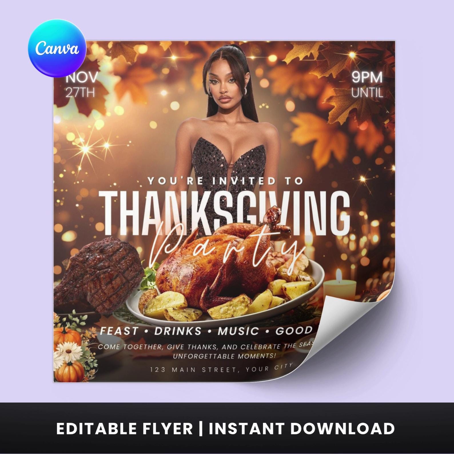 🦃✨ Celebrate the season of gratitude in style with this Thanksgiving Party Flyer Template! Designed for event planners, clubs, and party hosts, this editable Canva template helps you promote your Thanksgiving celebration with an elegant, festive vibe.
