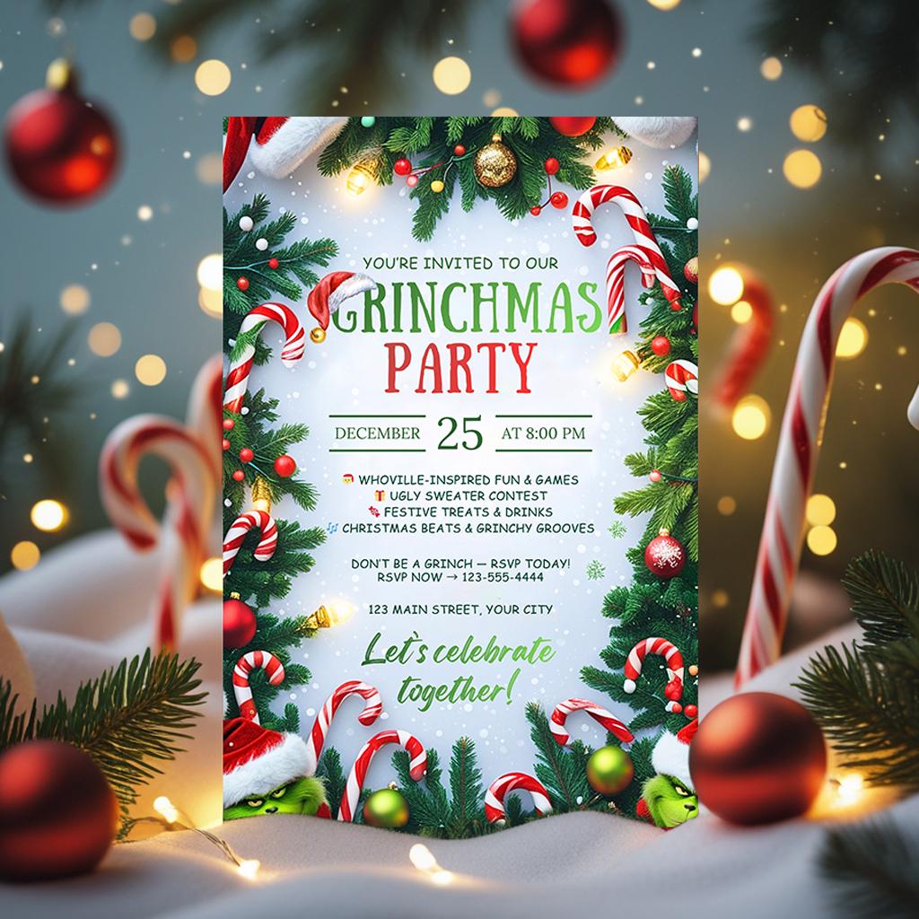 Make your Christmas event unforgettable with this Grinchmas Party Flyer Template!