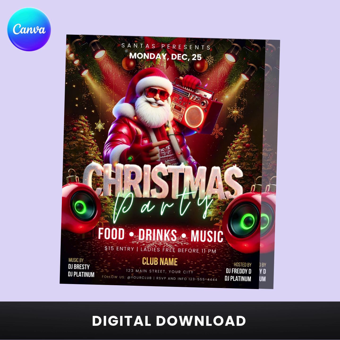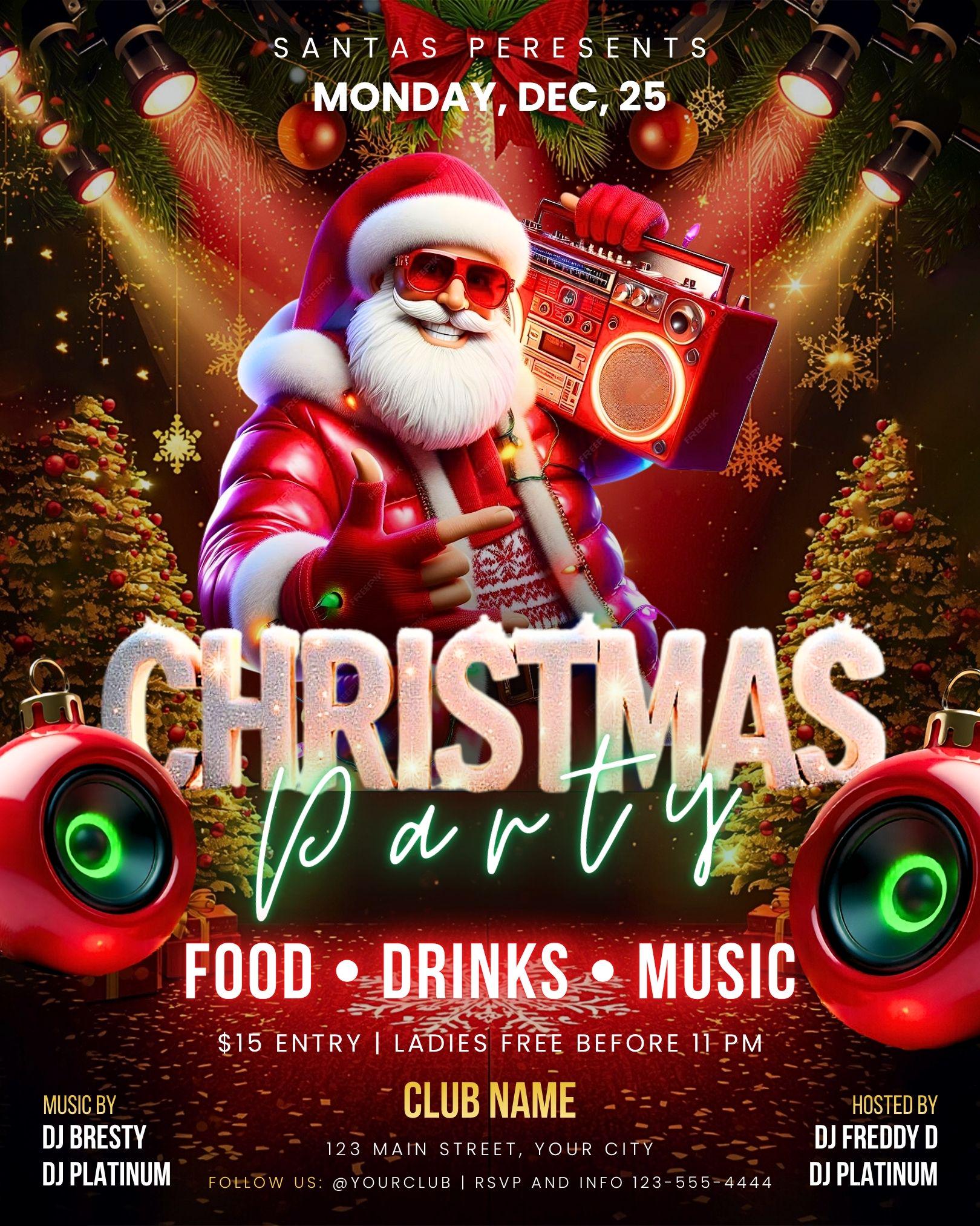 Perfect for clubs, lounges, bars, and party organizers, this bold and festive design features a cool Santa with neon lights, Christmas trees, and a red-gold glow โ the perfect vibe to promote your upcoming Christmas bash!