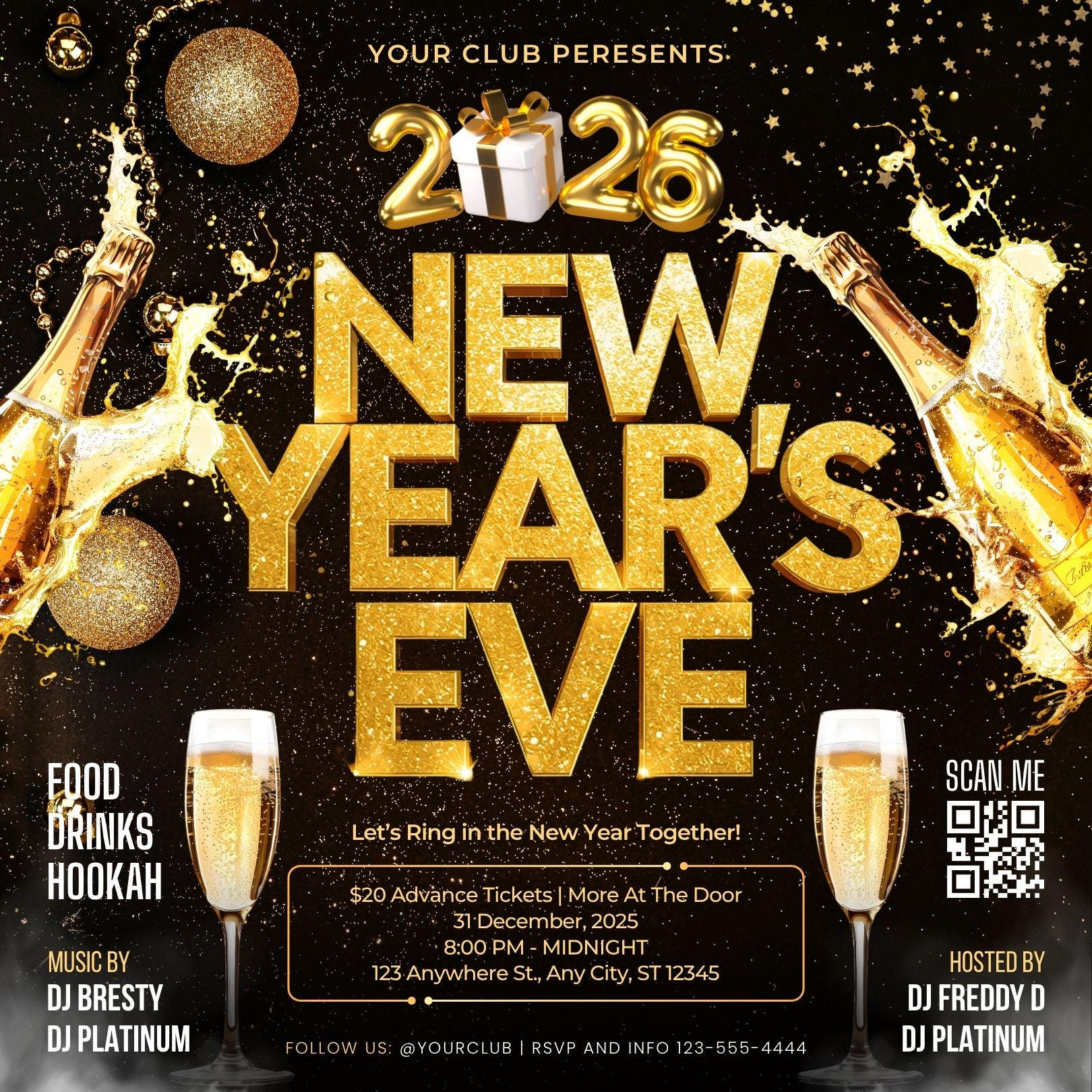✨ Ring in 2026 with style and sparkle! This New Year’s Eve Flyer Template is designed for clubs, lounges, bars, and event hosts looking to make a statement. The luxurious black-and-gold champagne theme sets the tone for an elegant night filled with excitement and celebration.