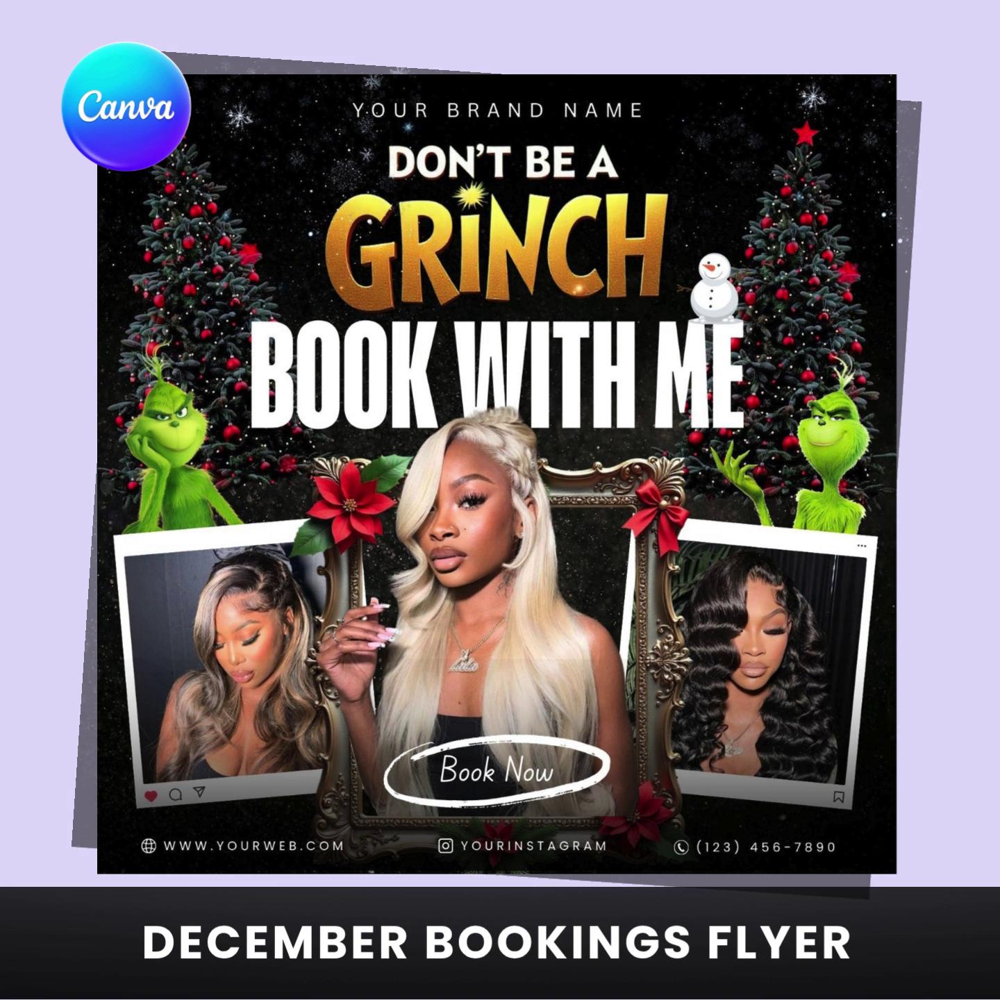 💚✨ Turn holiday procrastinators into loyal clients with this Grinch-Themed December Bookings Flyer Template!