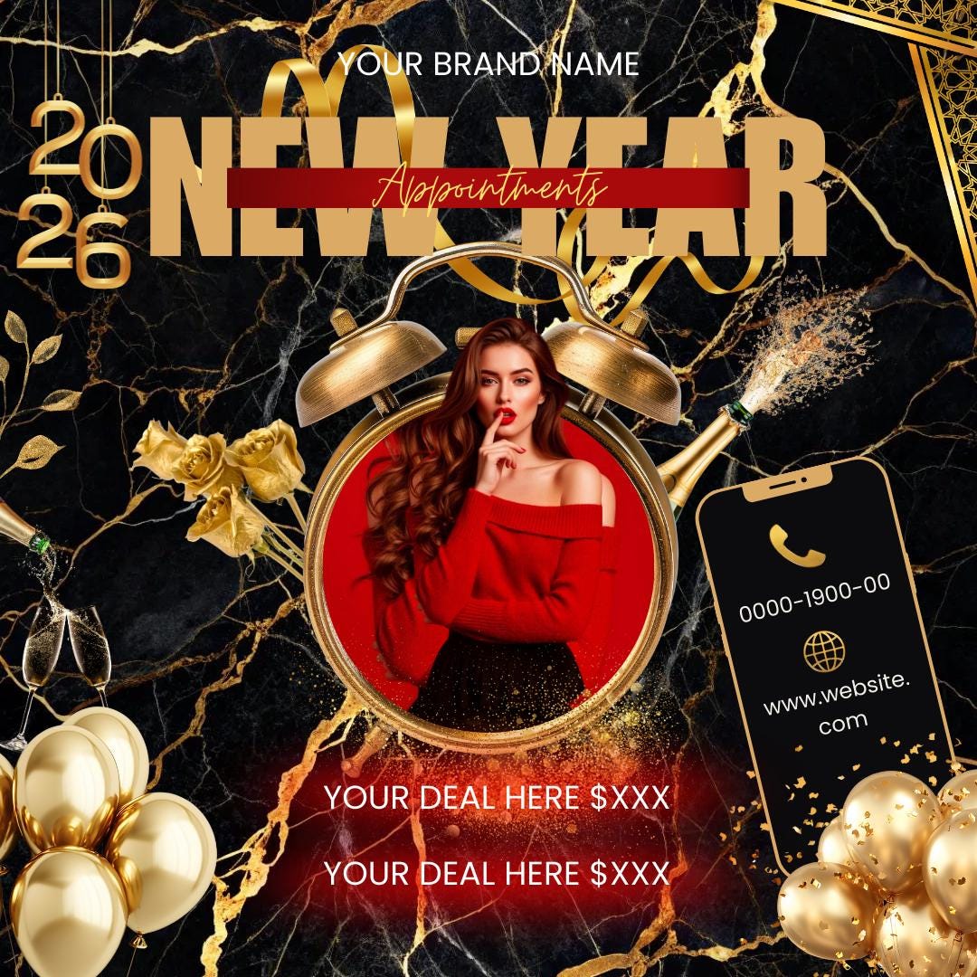 This elegant Canva flyer is perfect for beauty professionals, salons, hairstylists, makeup artists, and service-based businesses promoting New Year appointments, deals, or offers. The luxury black marble and gold aesthetic makes your brand look high-end and professional.