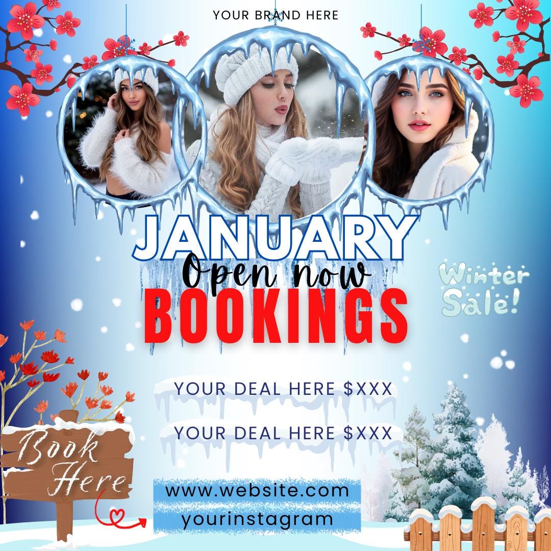 Announce your January availability with this eye-catching January Booking Flyer, designed with a cozy winter aesthetic. This Canva-editable template is perfect for beauty salons, hairstylists, makeup artists, lash techs, nail techs, and service providers promoting January bookings or winter specials.