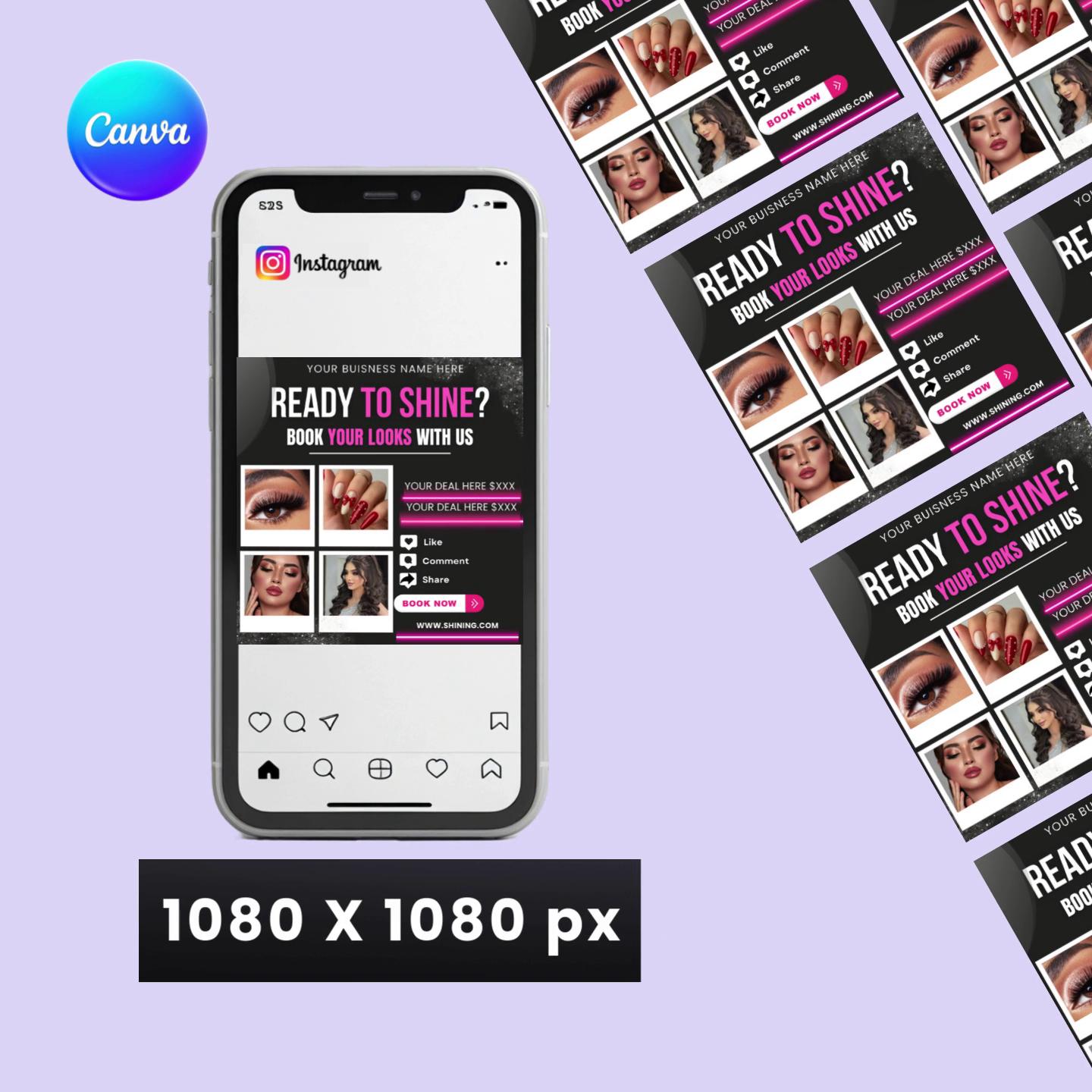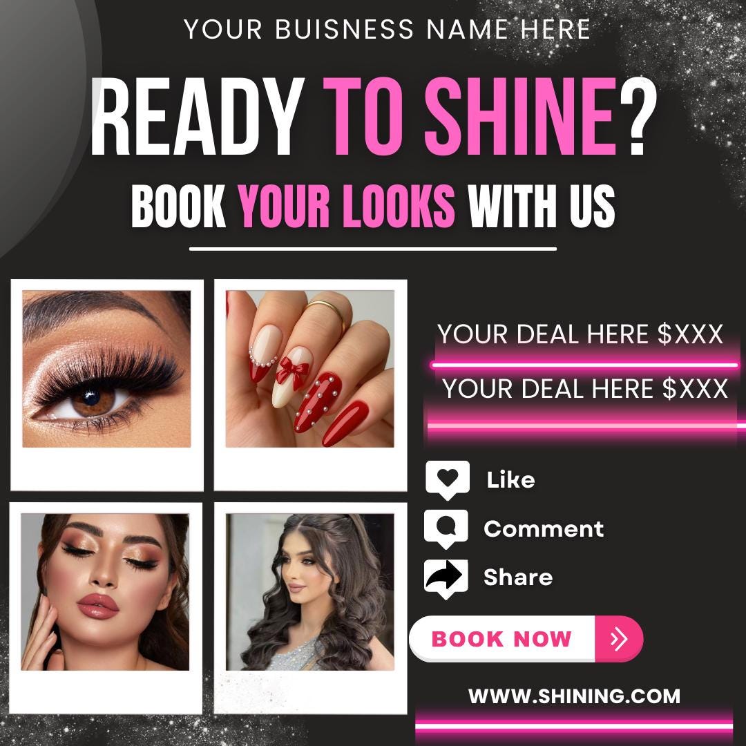 This Looks Booking Flyer is designed for makeup artists, nail techs, lash techs, hairstylists, salons, and beauty professionals who want to showcase services and attract bookings. With a sleek black background, glam visuals, and strong call-to-action, this flyer is perfect for social media marketing.