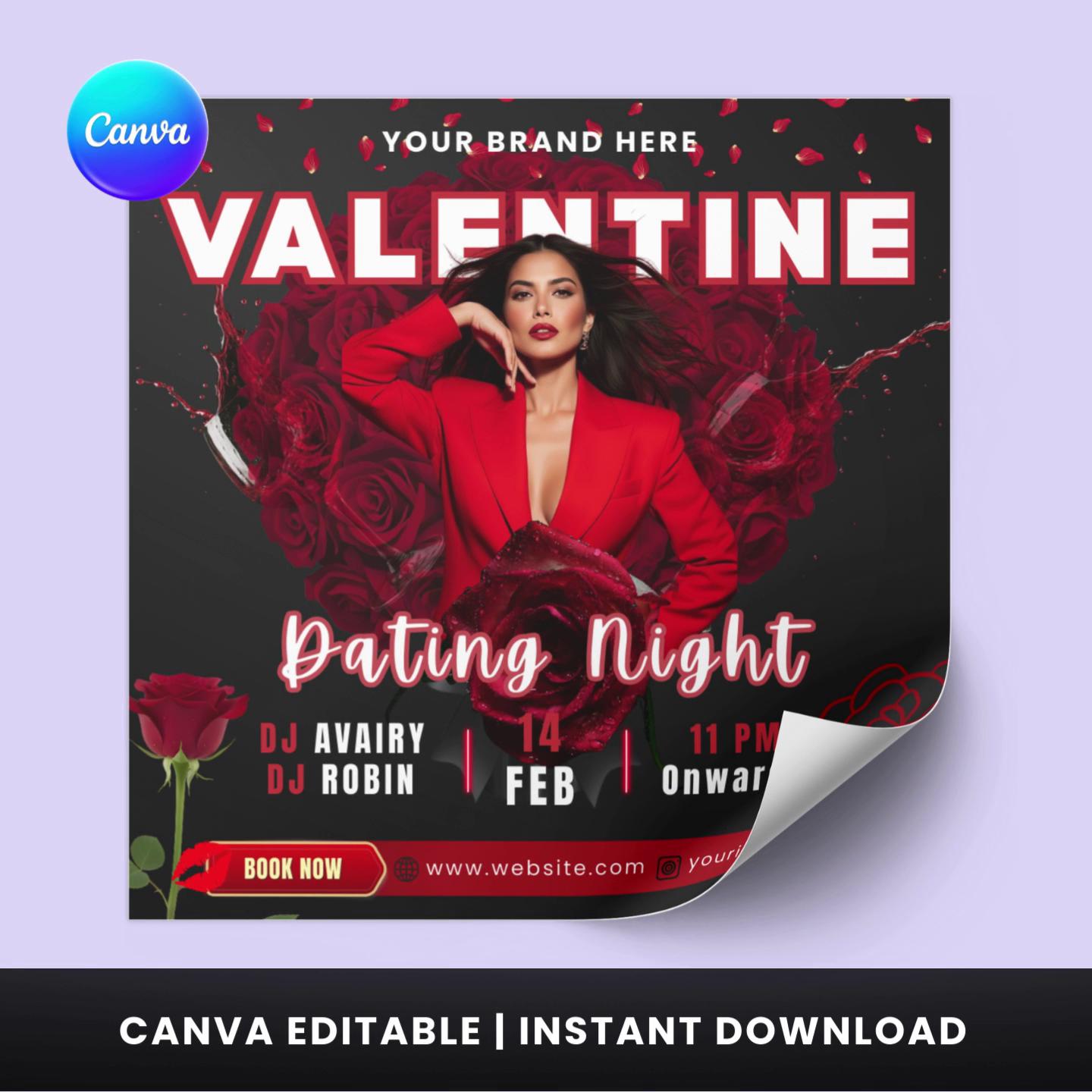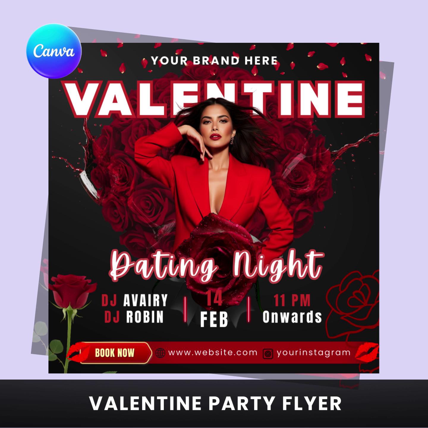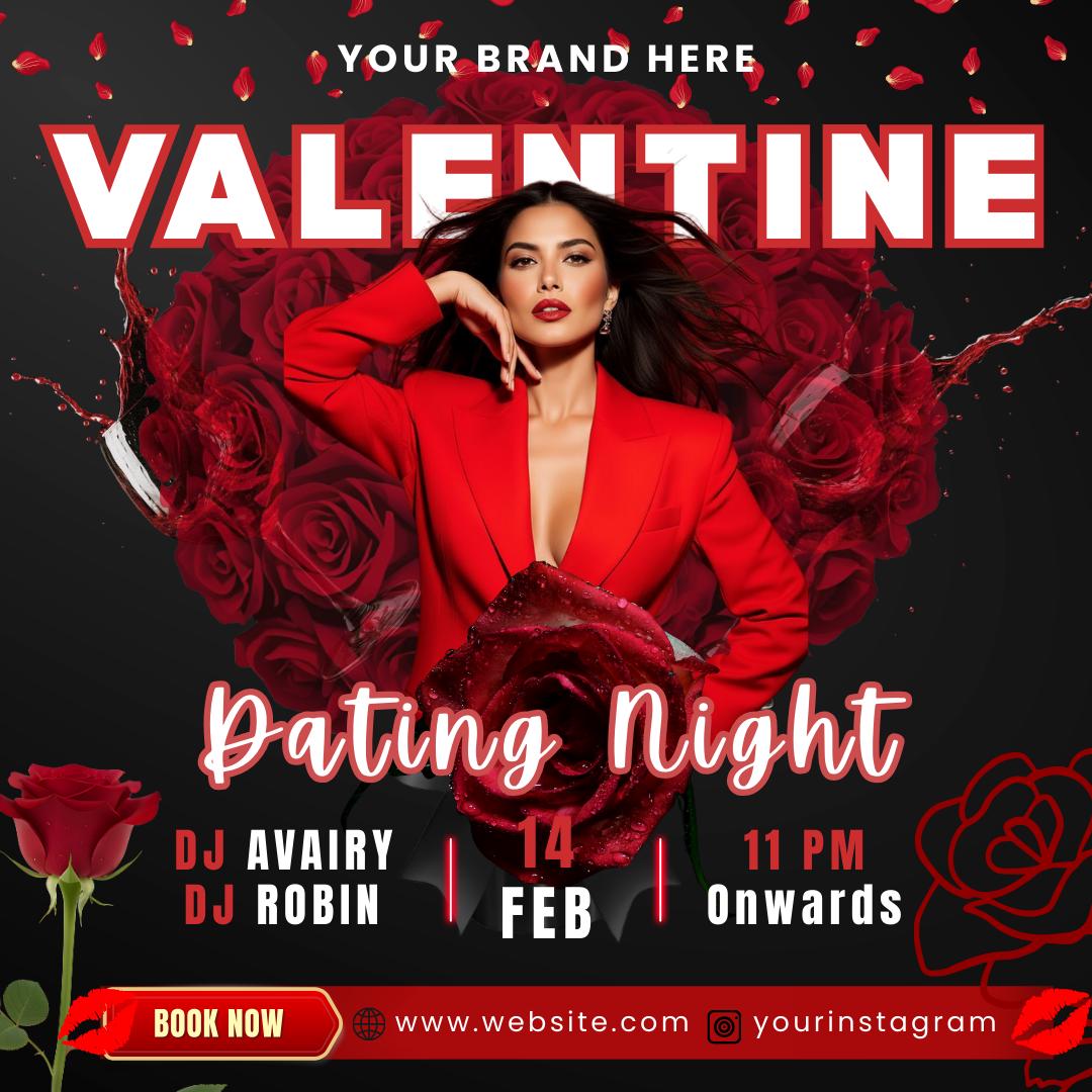 This Valentine Party Flyer is perfect for Valentine dating nights, club parties, DJ nights, lounge events, bars, and special Valentine celebrations. Designed with deep red tones, roses, and a glamorous party vibe, this Canva template helps you attract attention and boost event attendance.