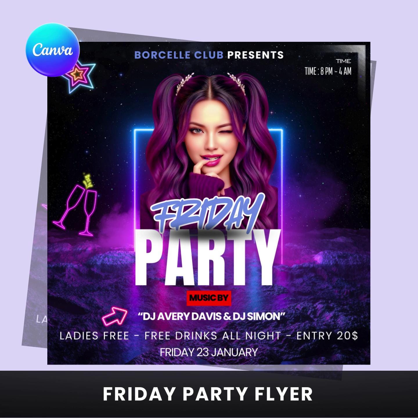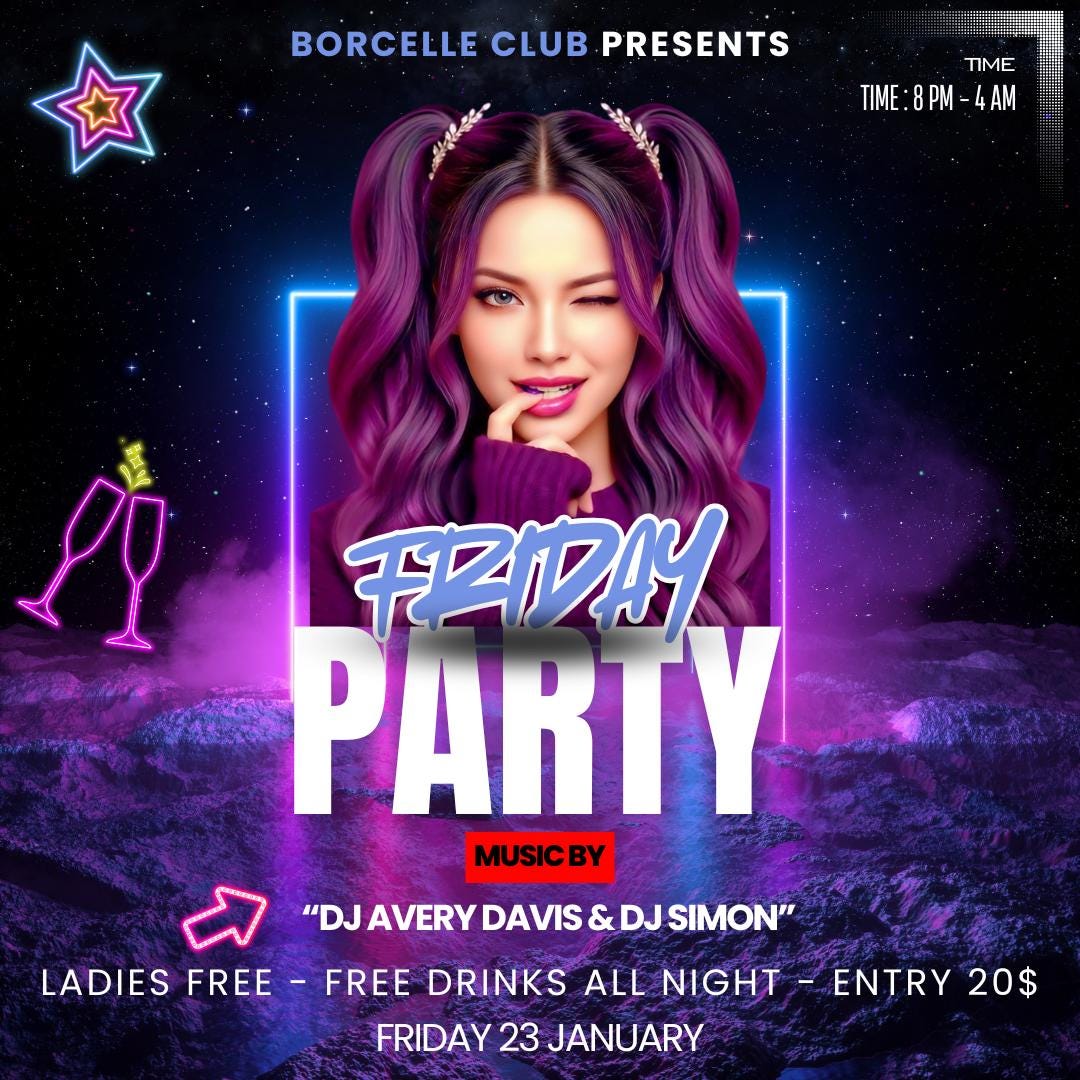 This Friday Party Flyer Canva Template is perfect for nightclubs, lounges, DJs, promoters, and event hosts looking to promote a Friday night party or club event. Featuring a bold neon aesthetic and modern nightlife vibe, this flyer is designed to grab attention and boost attendance.