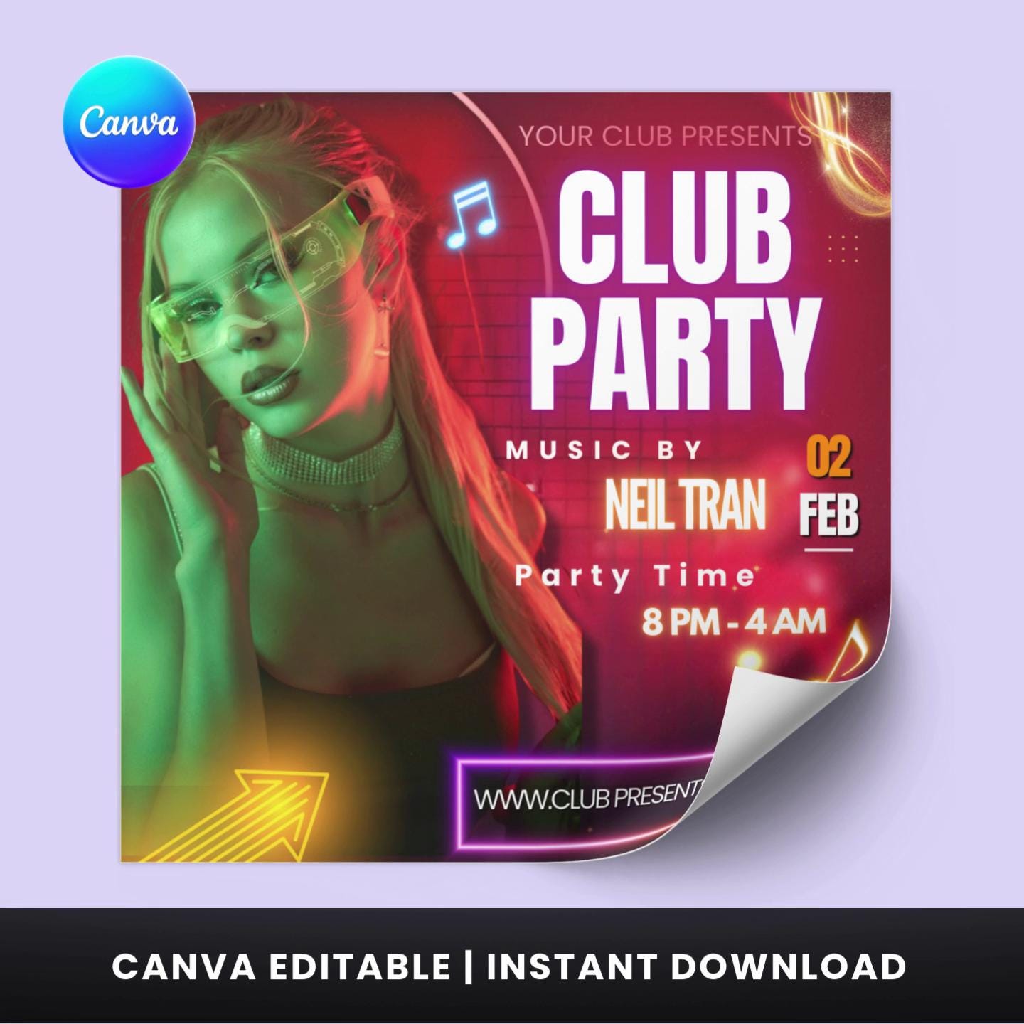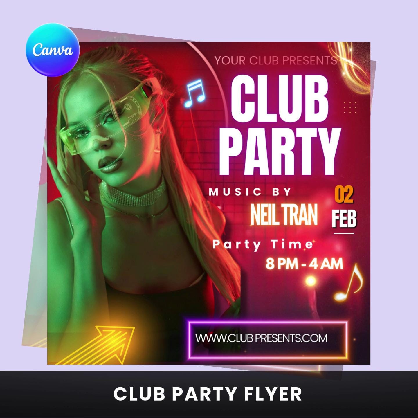 Create buzz for your next club party or music night with this eye-catching Club Party Flyer Template. Featuring neon effects and a modern nightlife aesthetic, this flyer is perfect for DJs, nightclubs, festivals, and late-night party events.