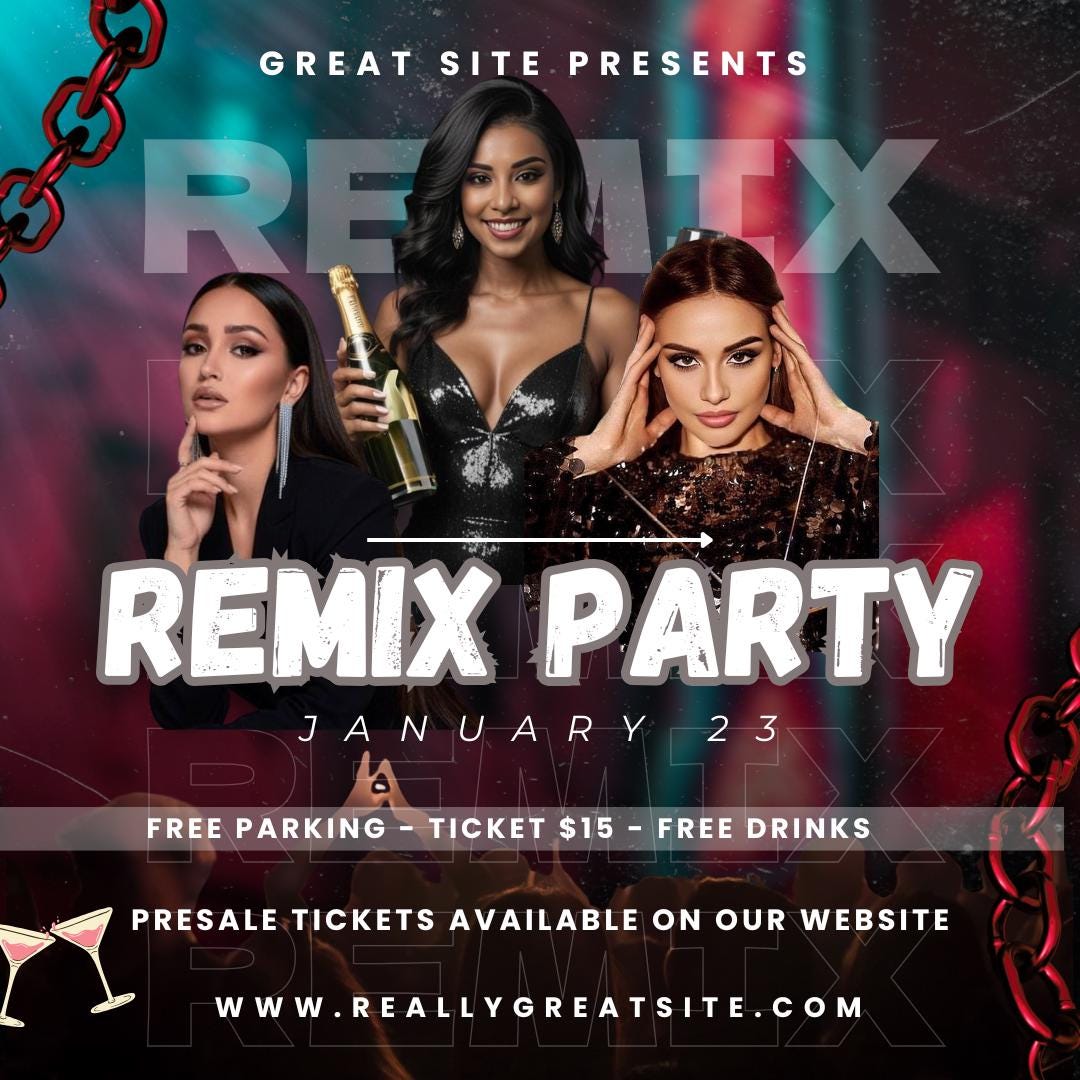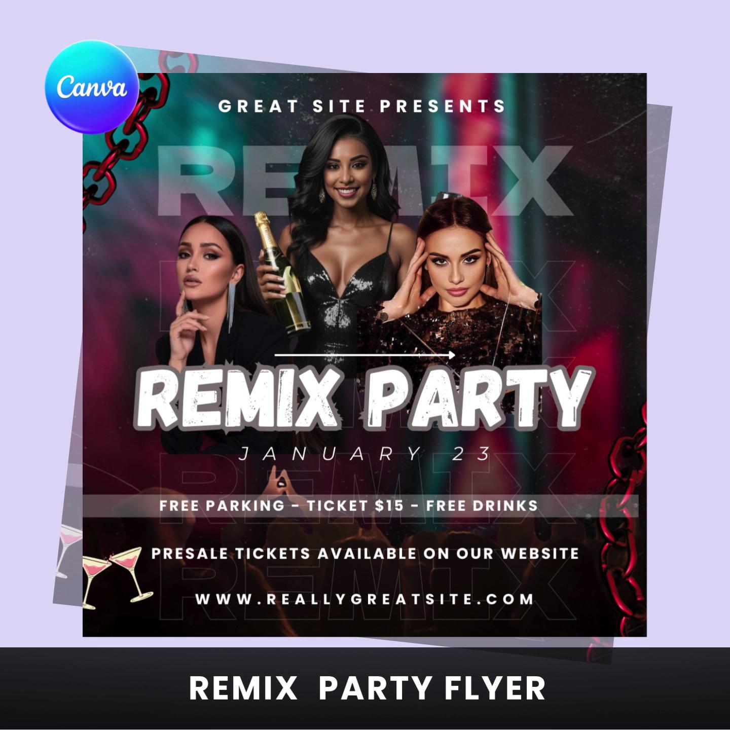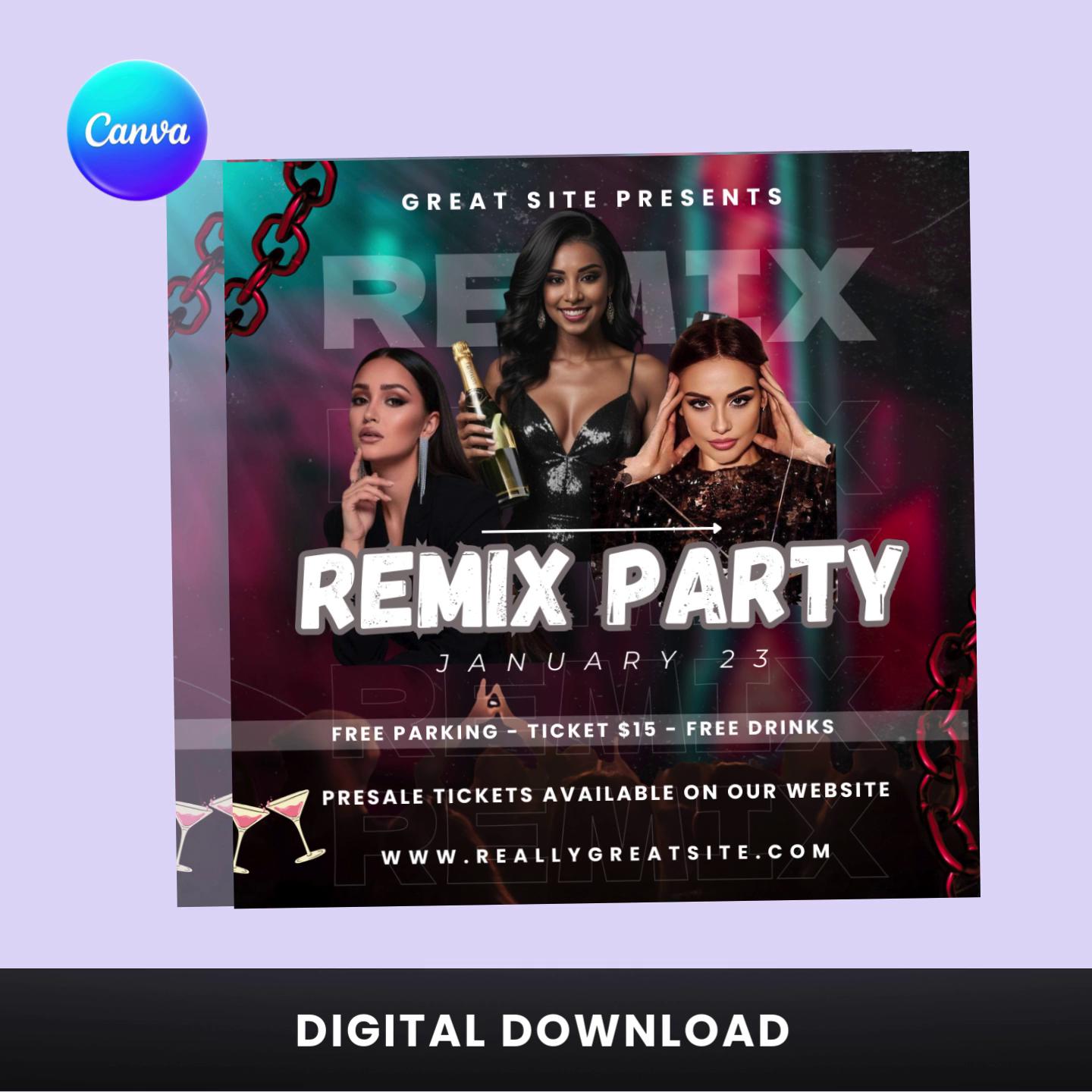 Promote your next event with this bold and modern Remix Party Flyer Template, perfect for clubs, DJs, lounges, and nightlife events. Designed to grab attention and drive attendance, this flyer works great for party promotions, DJ nights, and special club events.
