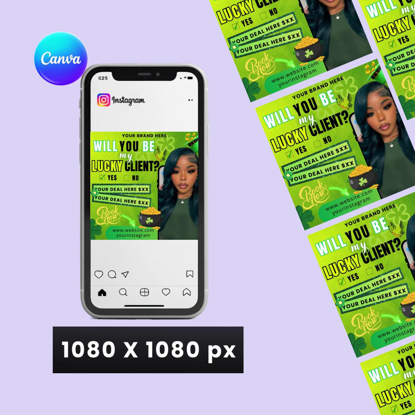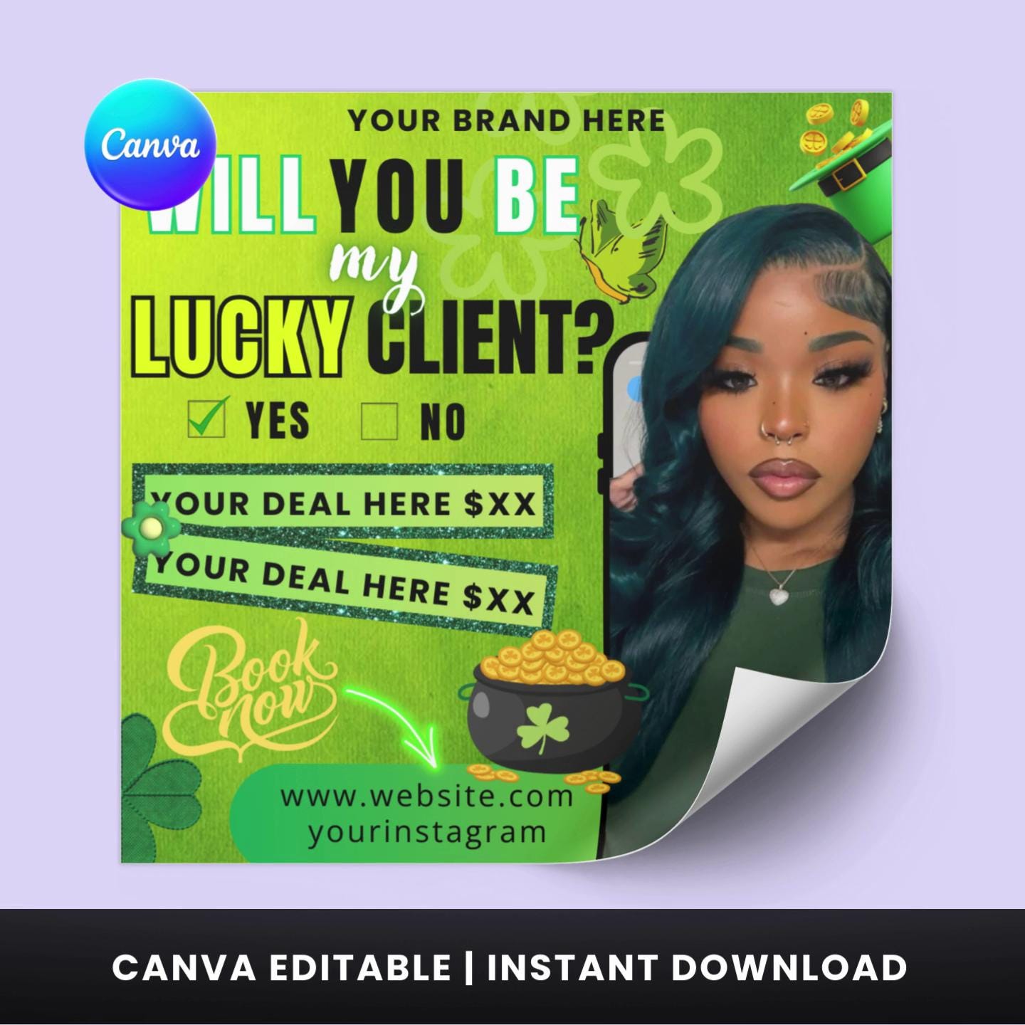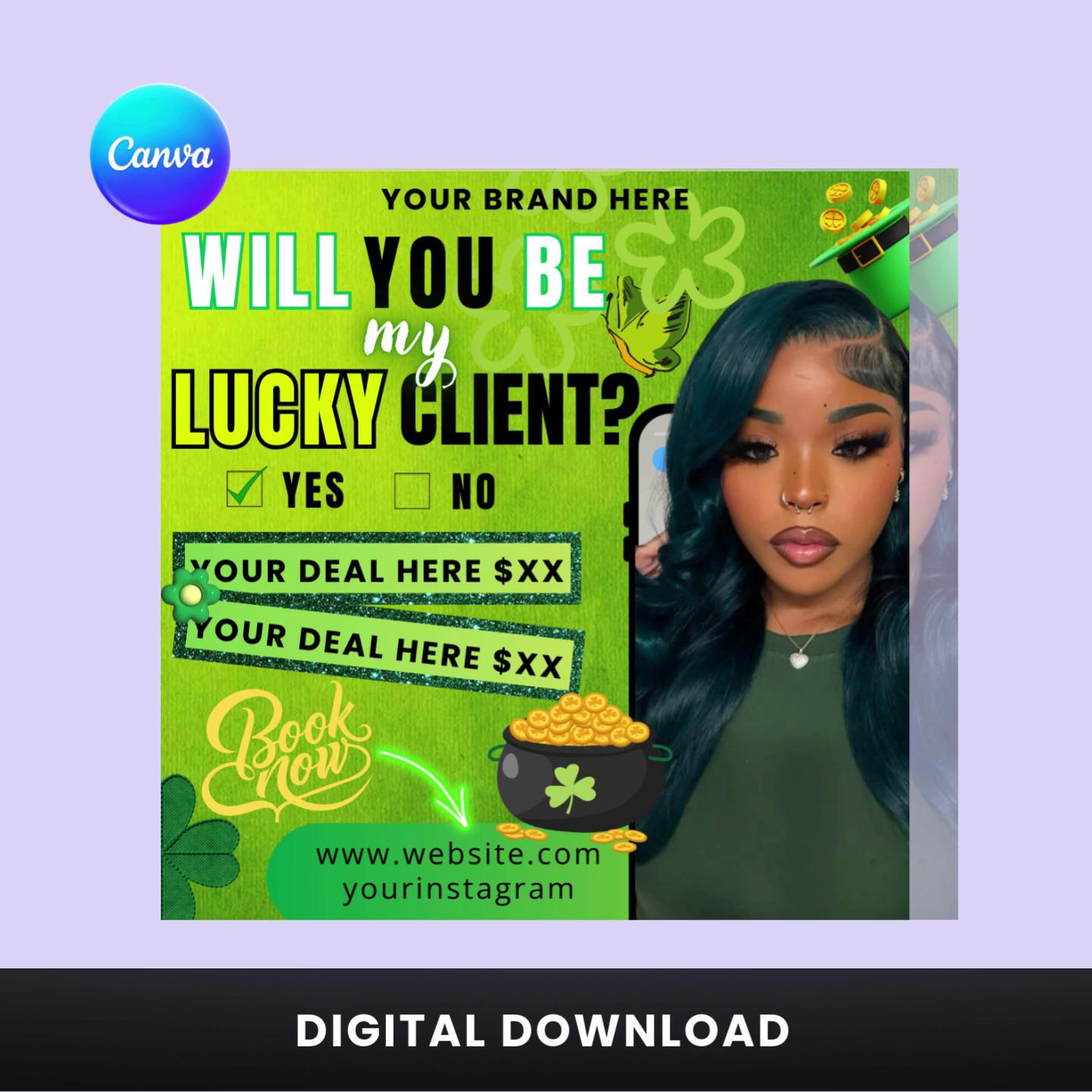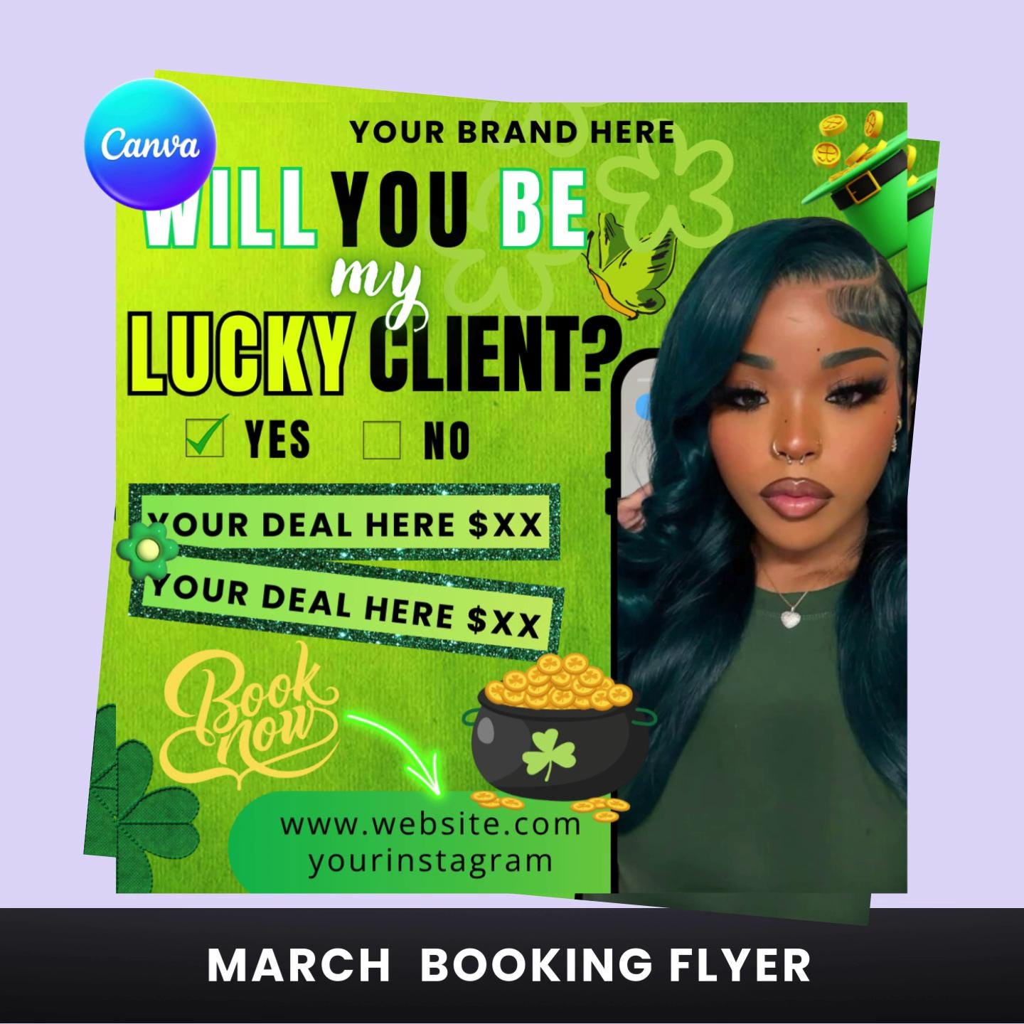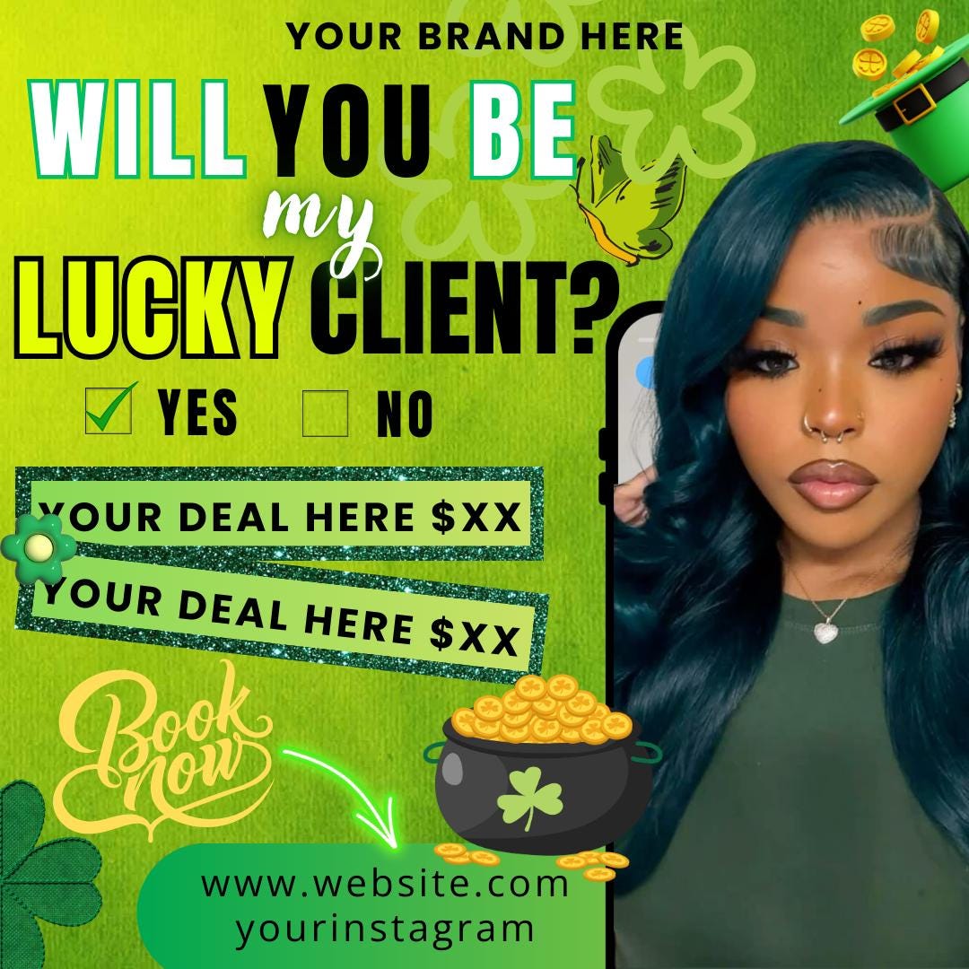 Stand out this March with this fun and eye-catching Lucky Client Booking Flyer Template. Perfect for hair stylists and beauty professionals who want a festive, St. Patrick’s–inspired way to announce availability and promotions.