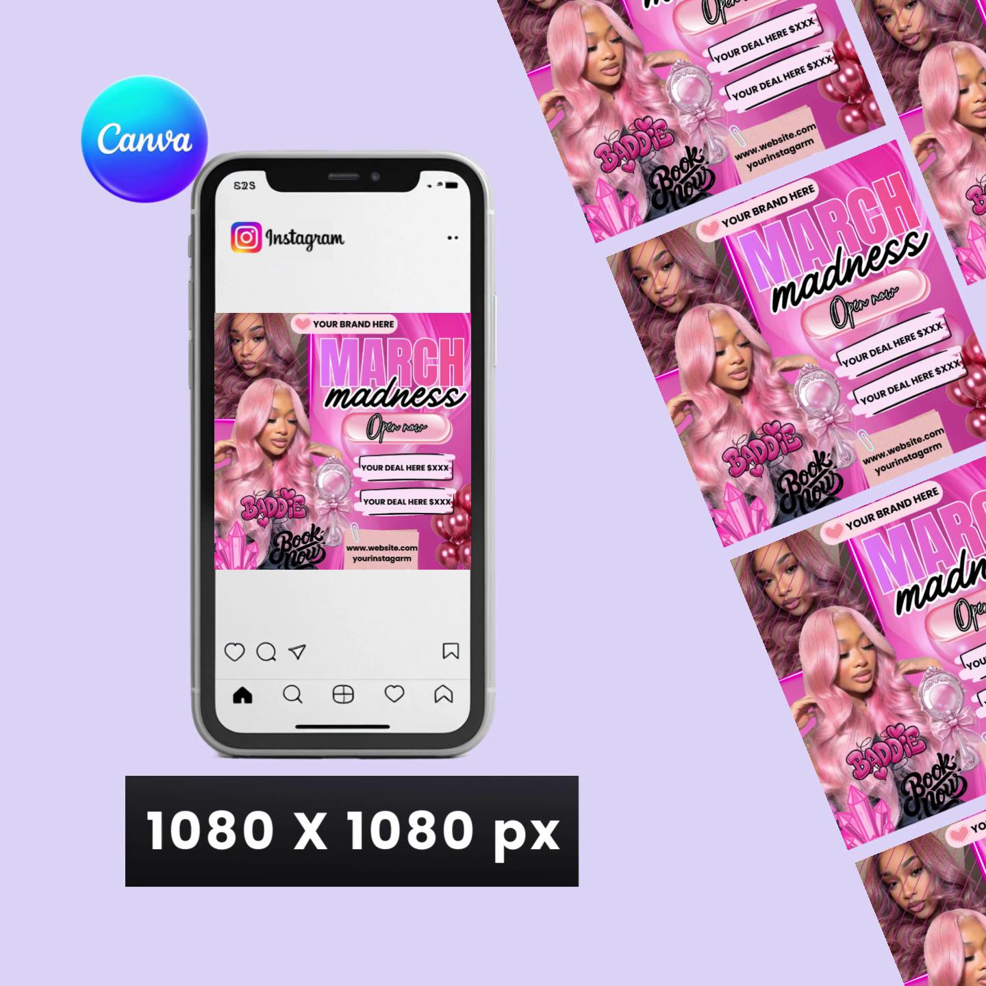 Secure your "baddie" clients with this ultra-glam, pink-themed booking flyer. Designed for the beauty professional who loves a luxury, high-end aesthetic, this "March Madness" template is perfect for promoting specials, new openings, or monthly availability.