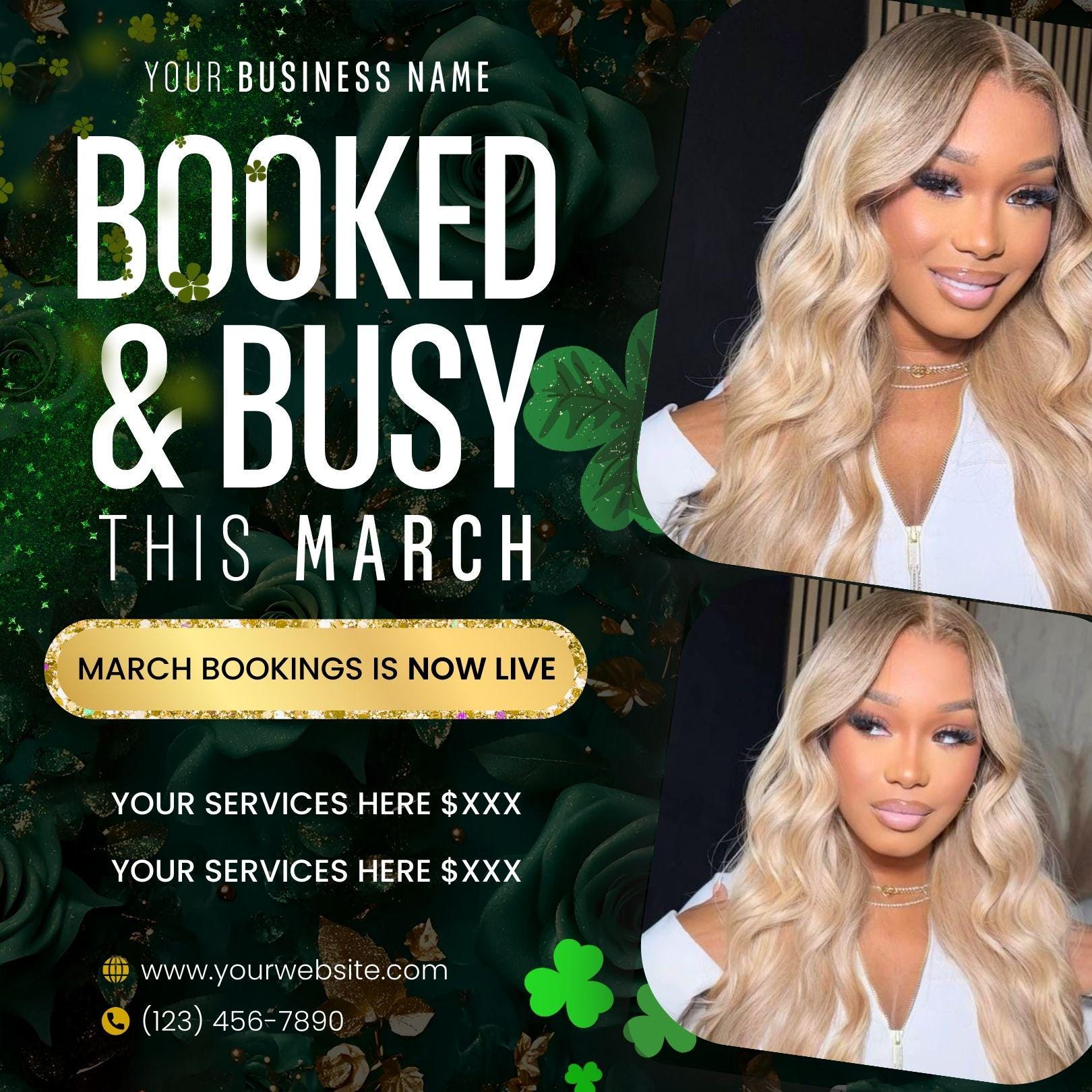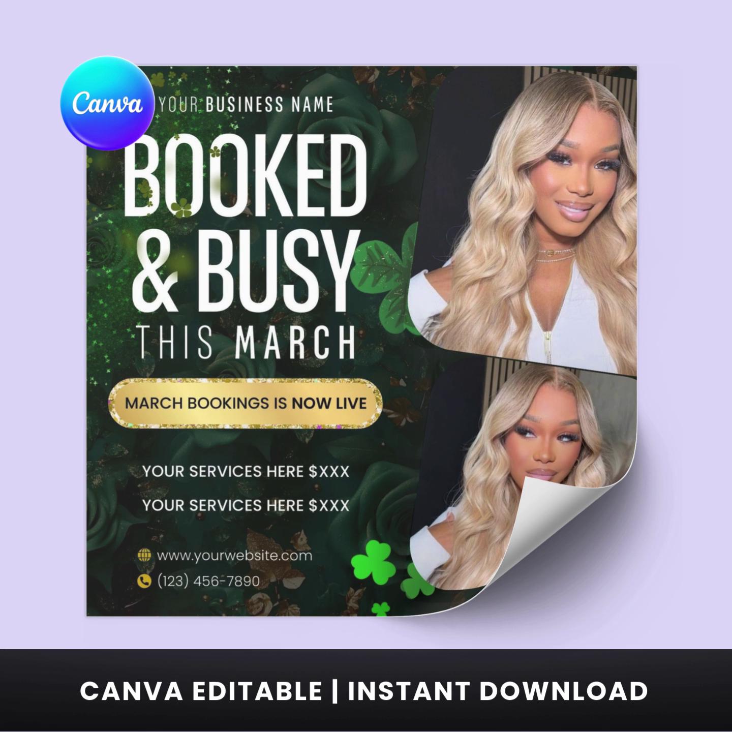 Fill your calendar with a professional, high-end social media flyer that stops the scroll. This "Booked & Busy" March template features a lush green and gold St. Patrick’s Day theme, designed specifically for beauty professionals who want to showcase their work and secure appointments effortlessly.