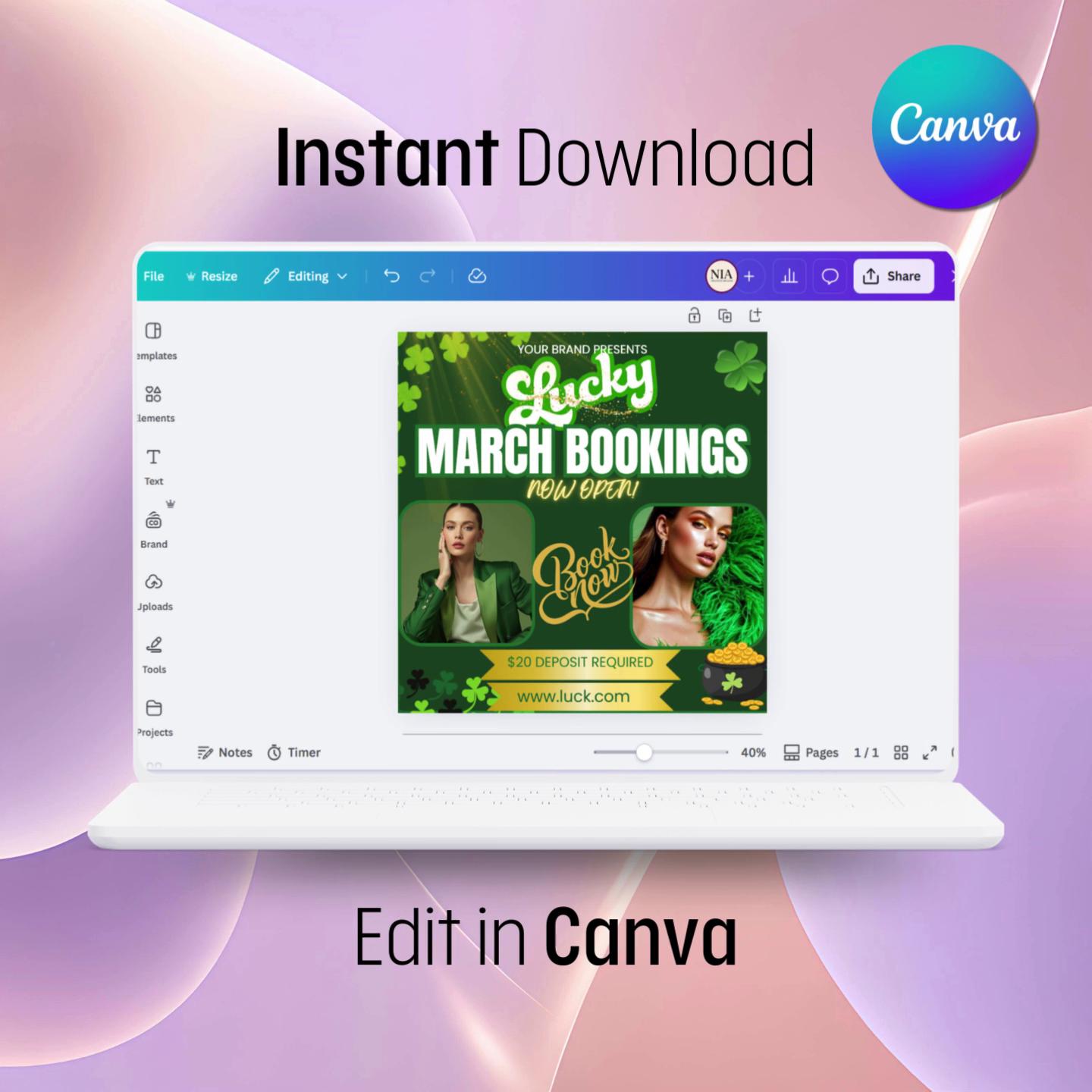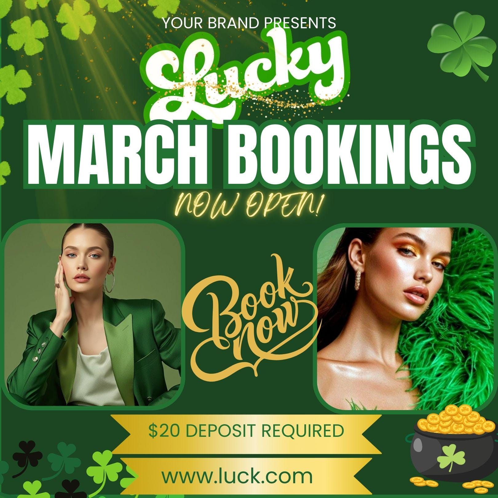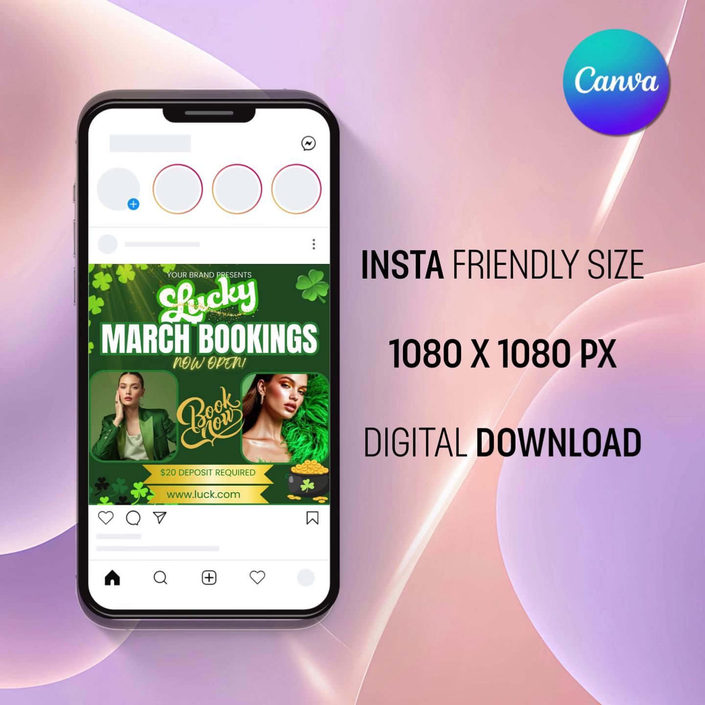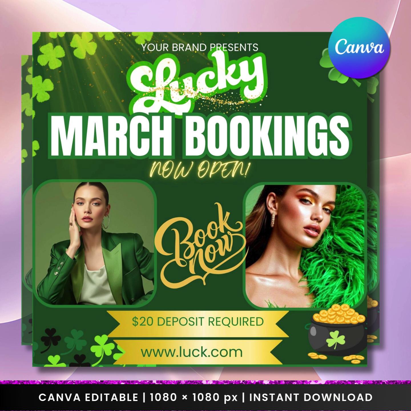 Lucky March Booking Flyer Canva Template | St Patricks Day Social Media Post | Green and Gold Hair Lash Beauty (Digital Download)