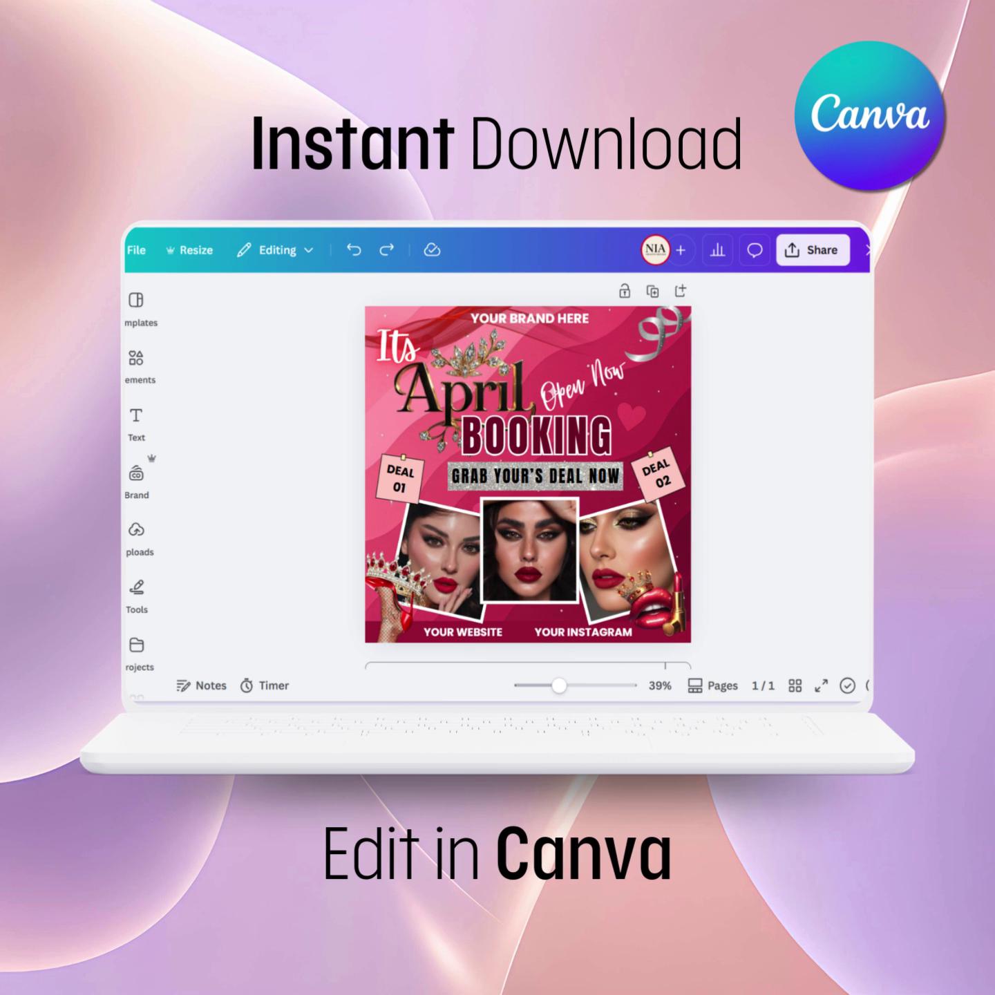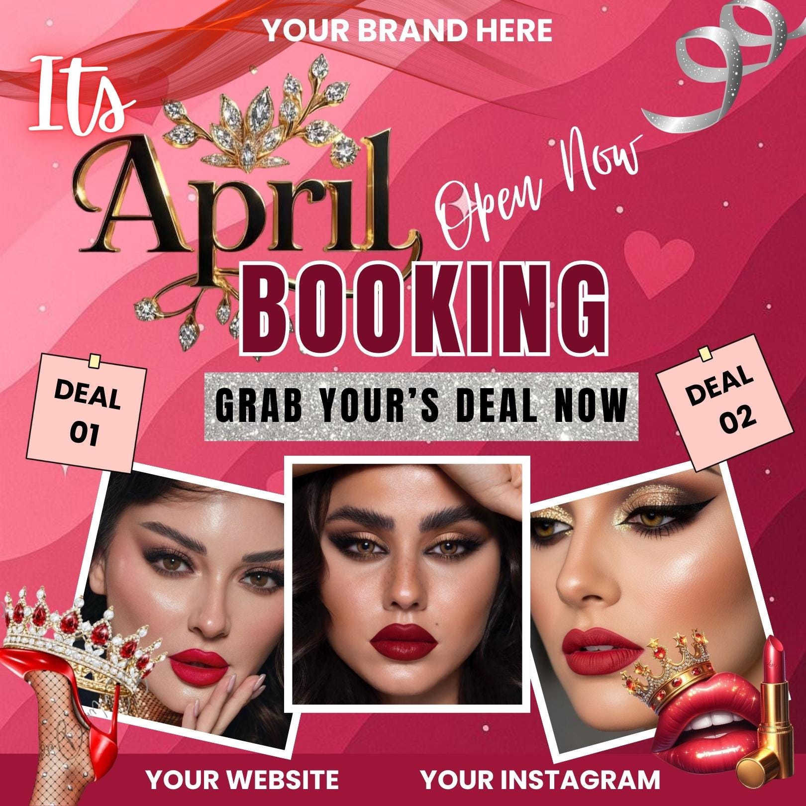 Step into the new month with a professional, high-end aesthetic that commands attention. This "April Booking" template features a deep pink and red regal theme, complete with crown and lipstick accents, designed specifically for beauty professionals who want to showcase their "baddie" aesthetic while filling their calendar.